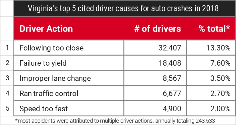 Traffic is a nuisance that most of us have to deal with, sometimes on a daily basis, so it’s not a surprise that we tend to be impatient drivers. According to the Virginia Department of Motor Vehicles, 2018 saw 131,848 car crashes, and being-in-a-rush factors into all of the top 5 causes. The number one cause of crashes — following too close — is almost double the runner-up (failure to yield).